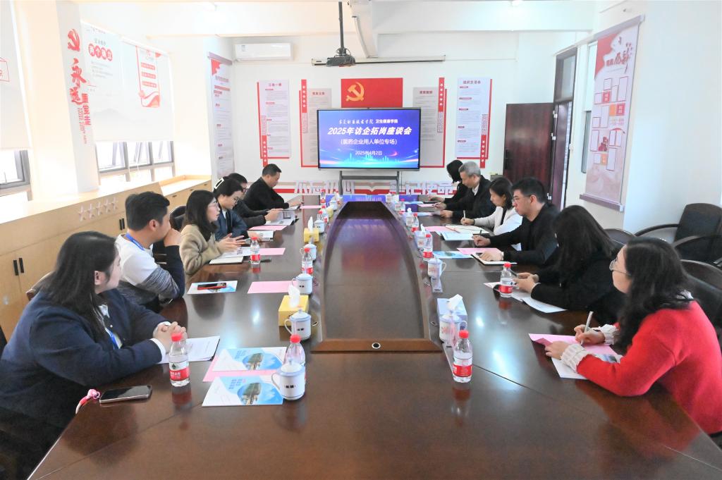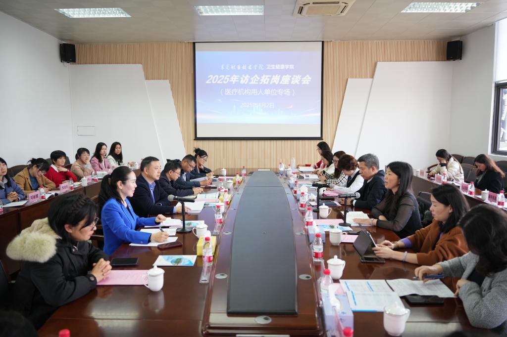 活动期间,学校分别面向医疗机构及医药企业同步召开两场访企拓岗座谈会。会上,杨云奇副校长对东莞市卫生健康局、东莞市人力资源服务中心及各医疗单位的支持表示诚挚的感谢,并介绍了我校整体概况及医药卫生类毕业生的就业情况。罗东副局长介绍了东莞市医疗行业的人才队伍现状并分析行业发展趋势,提出学校应加强与医疗单位的沟通联系,精准对接行业需求,进一步优化专业建设及人才培养模式。赵丽萍负责人介绍了我市高校毕业生就业的工作举措和支持政策,并期望今后与学校和卫健系统加强联系,共同推动毕业生就业工作。与会人员就人才培养方式及校企协同育人等议题展开了深入的交流与探讨。